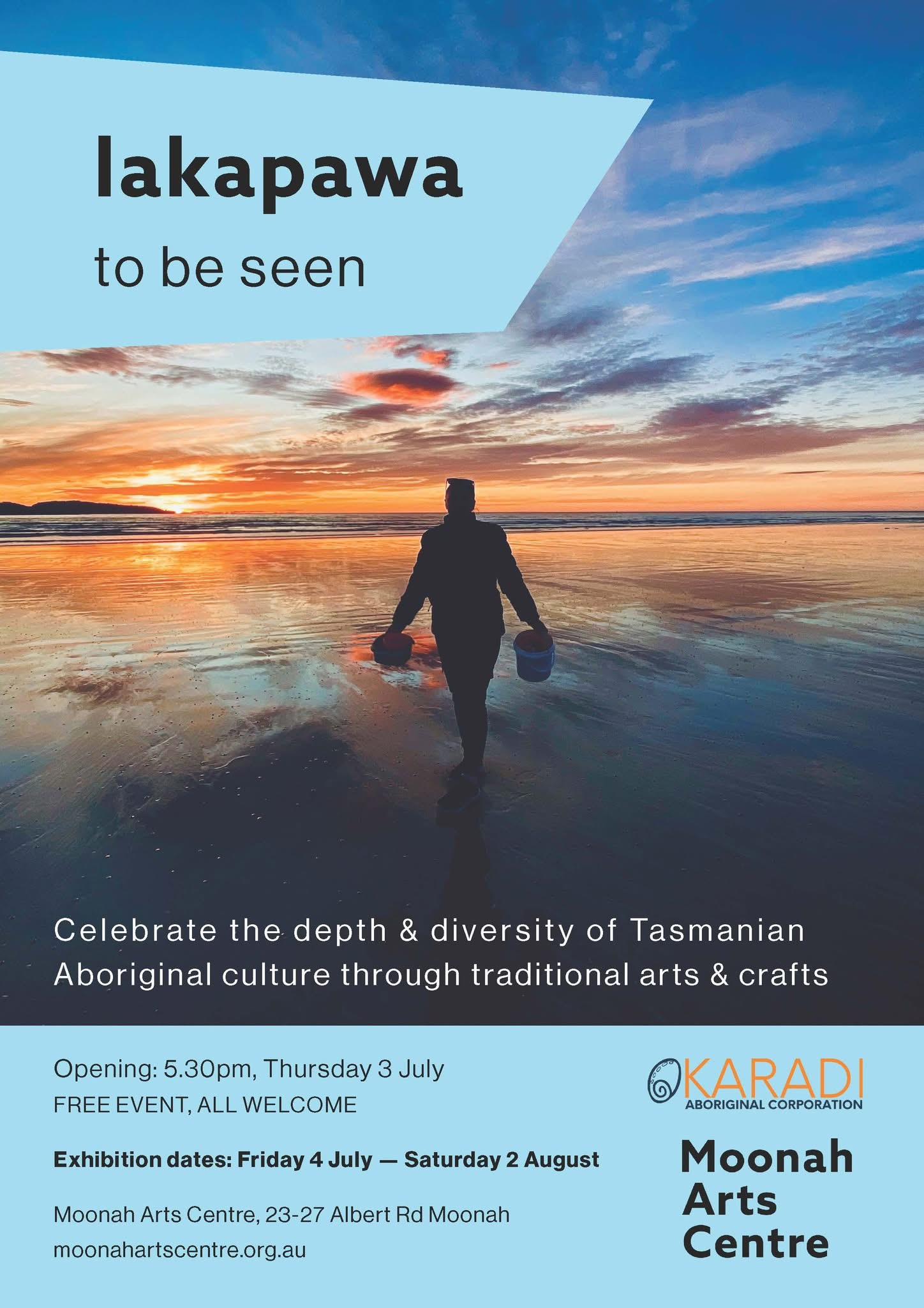 | 3 July – 2 August | Moonah | lakapawa – to be seen Celebrate the depth and diversity of Tasmanian Aboriginal culture through traditional arts and crafts. Opening night: Thursday 3 July at 5.30pm, Moonah Arts Centre, 23-27 Albert Road, Moonah. Exhibition open from Friday 3 July to Saturday 2 August. |
